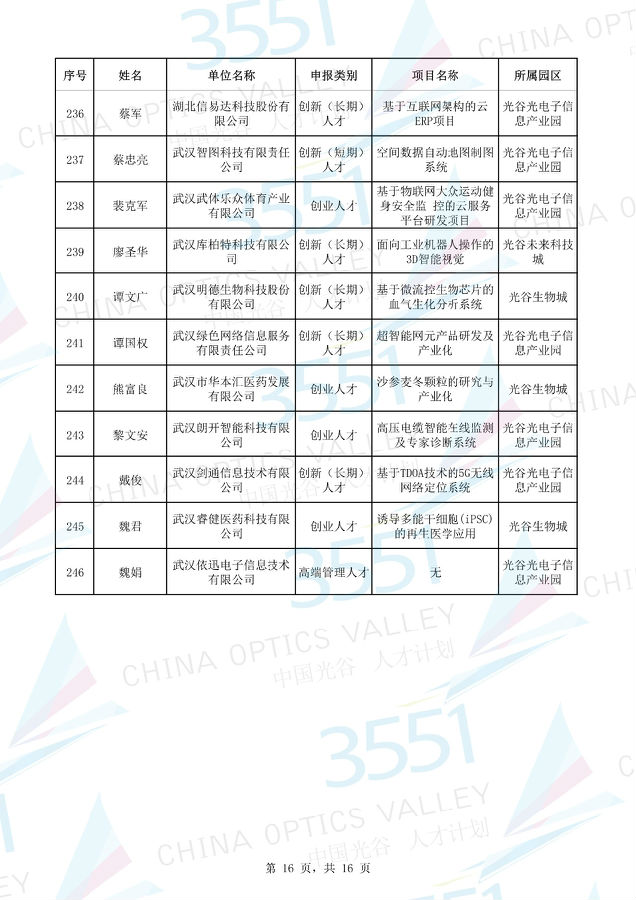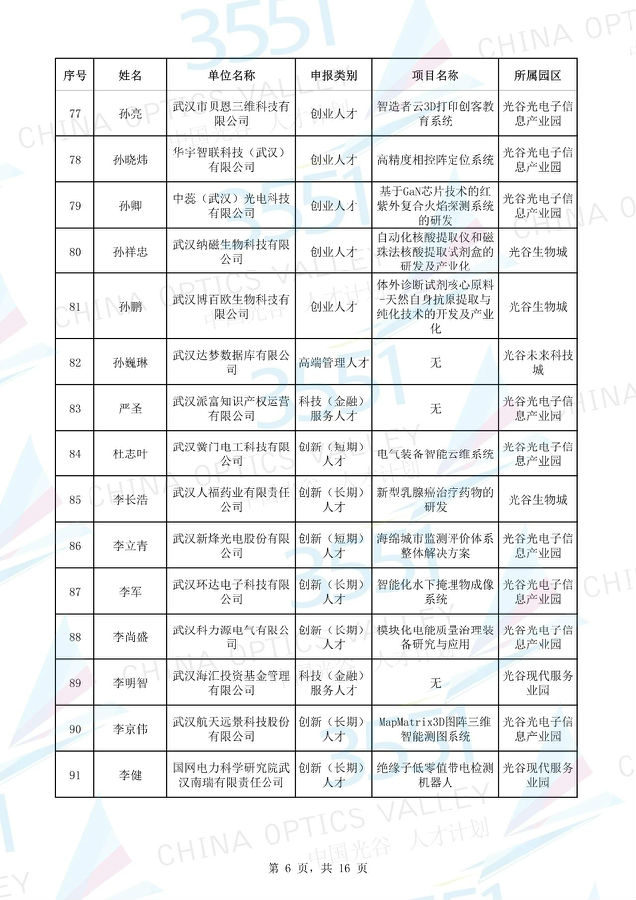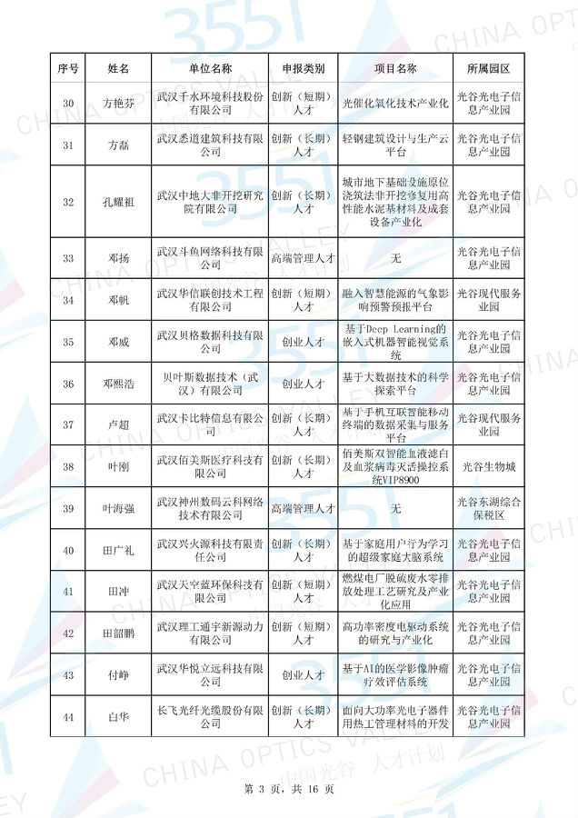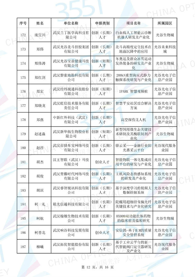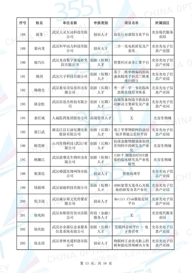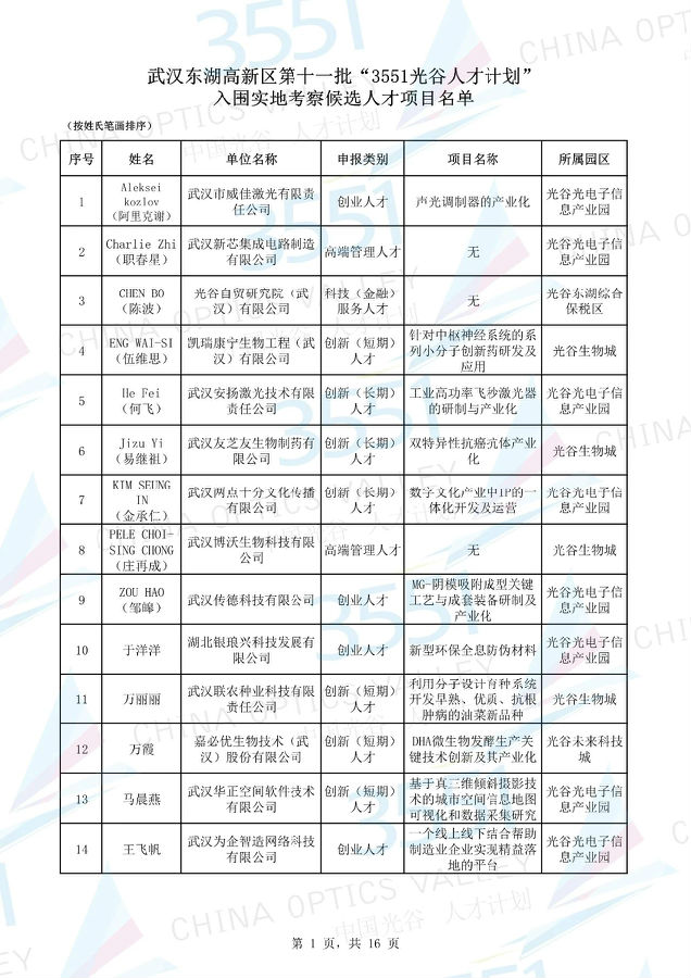 附:武漢東湖高新區(qū)第十一批“3551光谷人才計(jì)劃”入圍實(shí)地考察候選人才項(xiàng)目名單