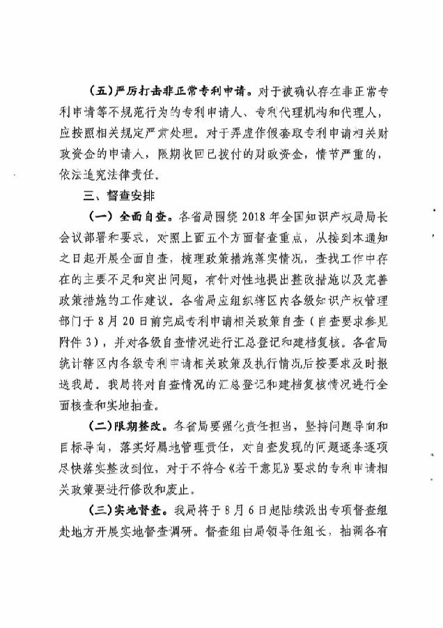 (三)實地督查。我局將于8月6日起陸續(xù)派出專項督查組赴地方開展實地督查調研。督查組由局領導任組長,抽調各有關部門共同參與。督查組將采用抽查、暗訪、座談等形式,運用大數(shù)據(jù)分析等手段對專利申請相關政策調整落實情況進行核查。