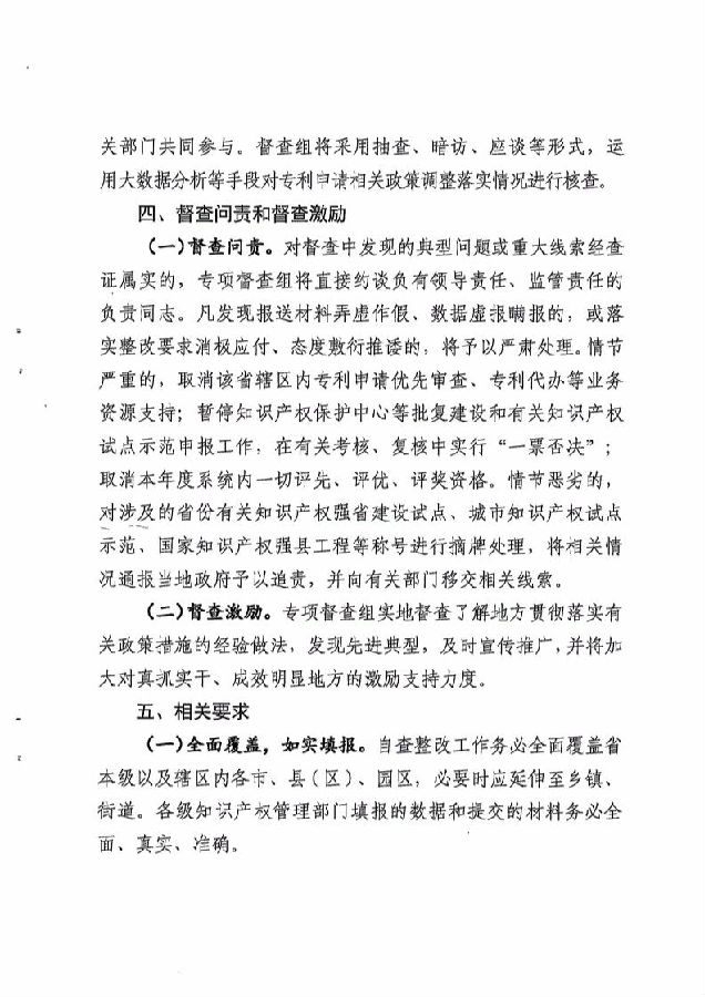 (一)督查問責。對督查中發(fā)現(xiàn)的典型問題或重大線索經(jīng)查證屬實的,專項督查組將直接約談負有領導責任、監(jiān)管責任的負責同志。凡發(fā)現(xiàn)報送材料弄虛作假、數(shù)據(jù)虛報瞞報的,或落實整改要求消極應付、態(tài)度敷衍推諉的,將予以嚴肅處理。情節(jié)嚴重的,取消該省轄區(qū)內專利申請優(yōu)先審查、專利代辦等業(yè)務資源支持;暫停知識產權保護中心等批復建設和有關知識產權試點示范申報工作,在有關考核、復核中實行“一票否決”取消本年度系統(tǒng)內一切評先、評優(yōu)、評獎資格。情節(jié)惡劣的,對涉及的省份有關知識產權強省建設試點、城市知識產權試點示范、國家知識產權強縣工程等稱號進行摘牌處理,將相關情況通報當?shù)卣枰宰坟?并向有關部門移交相關線索。