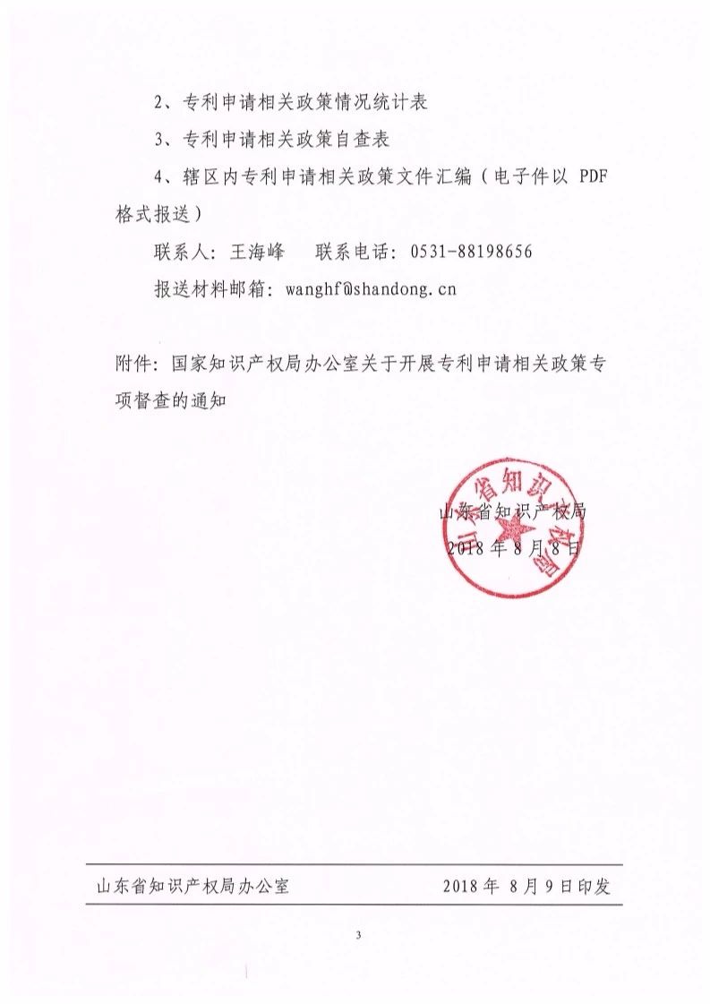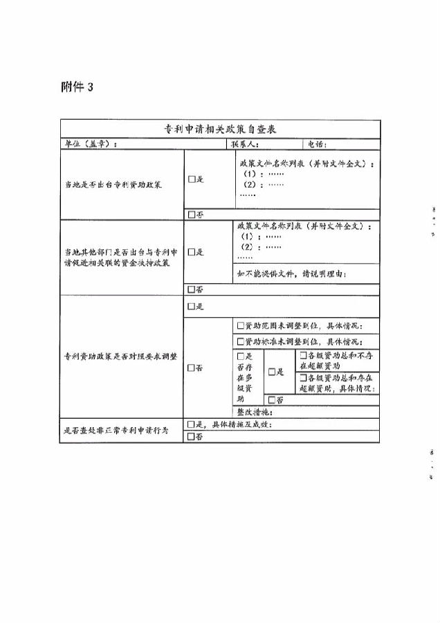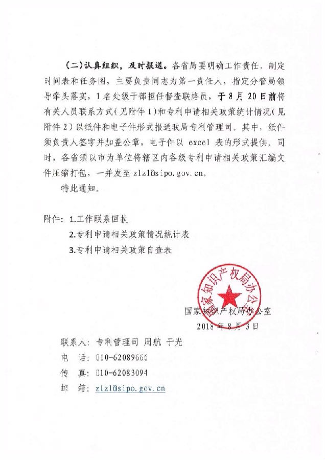 (二)認真組織,及時報送。各省局要明確工作責任,制定時間表和任務圖,主要負責同志為第一責任人,指定分管局領導牽頭落實,1名處級干部擔任督查聯(lián)絡員,于8月20日前將有關人員聯(lián)系方式(見附件1)和專利申請相關政策統(tǒng)計情況(見附件2)以紙件和電子件形式報送我局專利管理司。其中,紙件須負責人簽字并加蓋公章,電子件以 excel表的形式提供。同時,各省須以市為單位將轄區(qū)內各級專利申請相關政策匯編文件壓縮打包,一并發(fā)至z1 zas ipo.gov.cn。