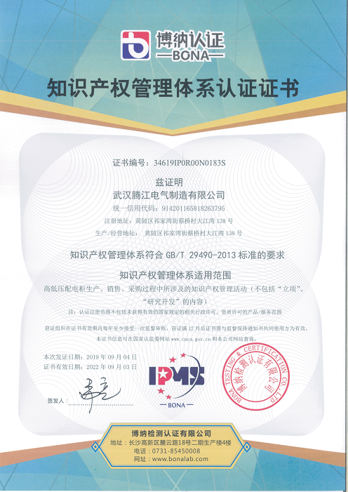 熱烈祝賀武漢騰江電氣制造有限公司于2019年9月獲得知識(shí)產(chǎn)權(quán)貫標(biāo)認(rèn)證證書,這意味著騰江電氣在知識(shí)產(chǎn)權(quán)領(lǐng)域獲得到重要認(rèn)可,在知識(shí)產(chǎn)權(quán)方面得到進(jìn)一步規(guī)范和在綜合競(jìng)爭(zhēng)力得到進(jìn)一步提升。
